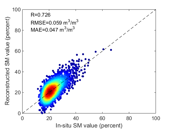 Fig. 5. Scatters of the in-situ/reconstructed soil moisture values in selected in-situ stations