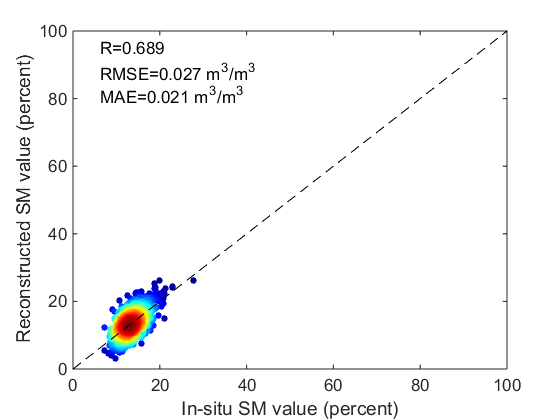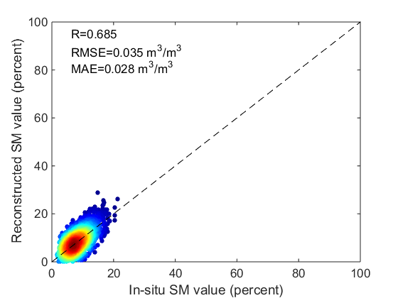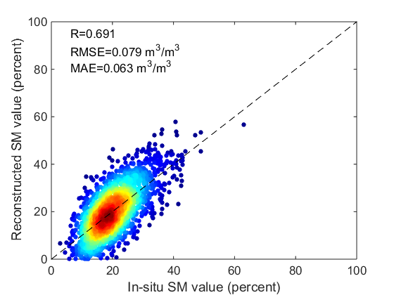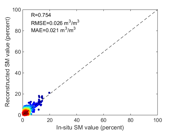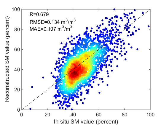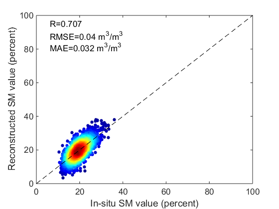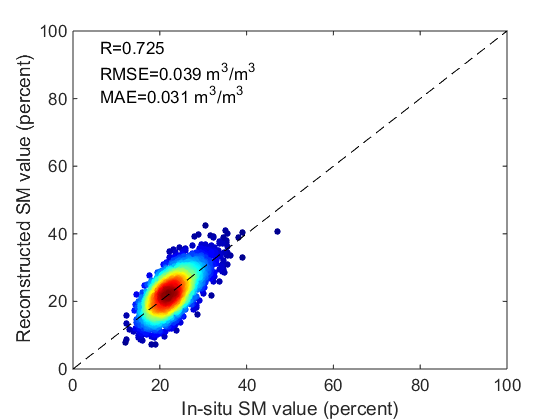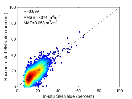 Fig. 6. Scatters of the in-situ/reconstructed soil moisture values in selected in-situ stations
